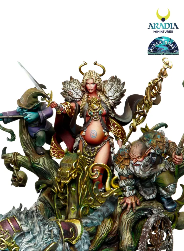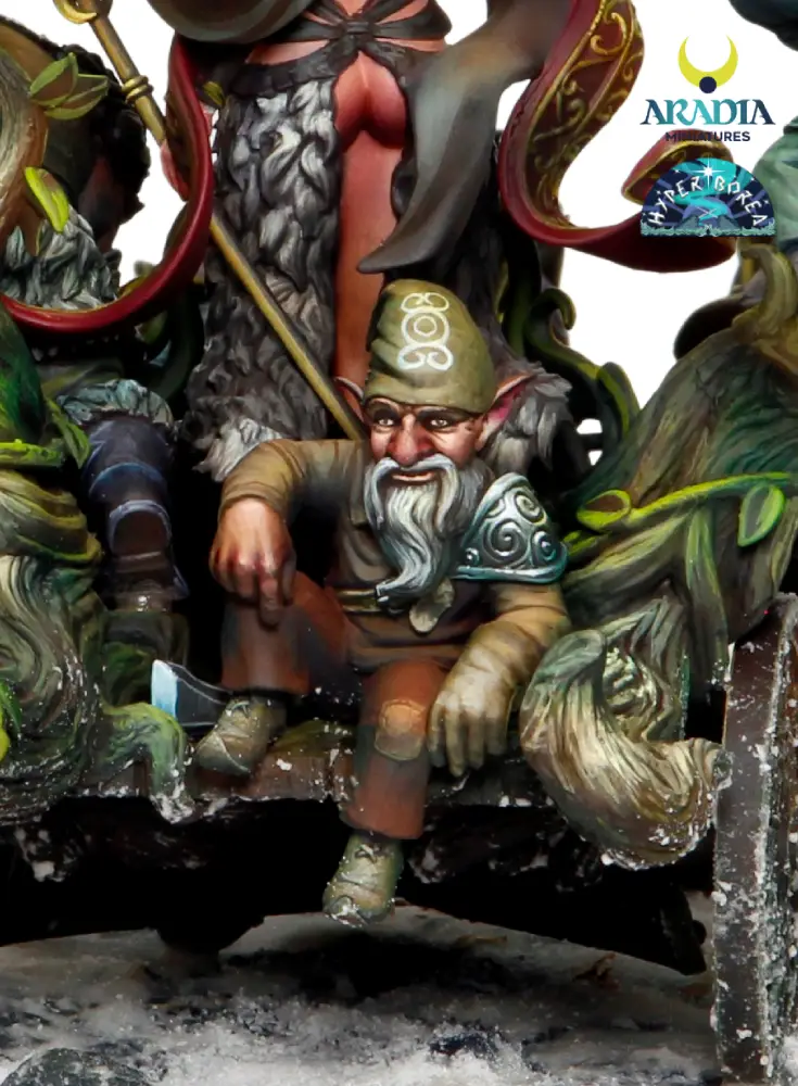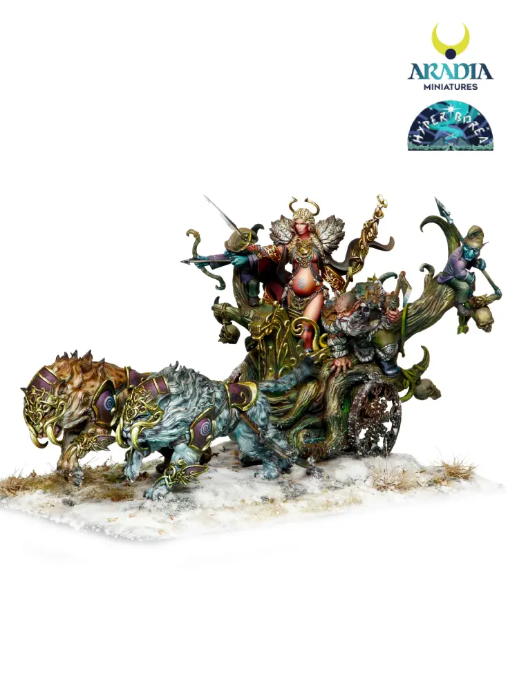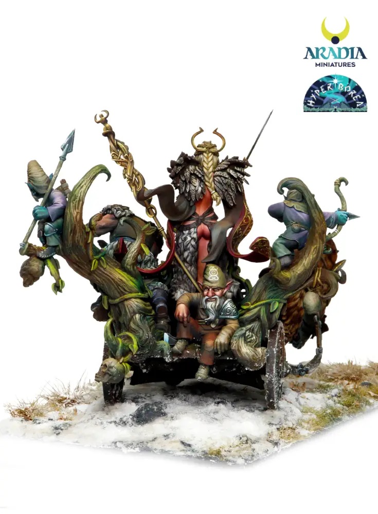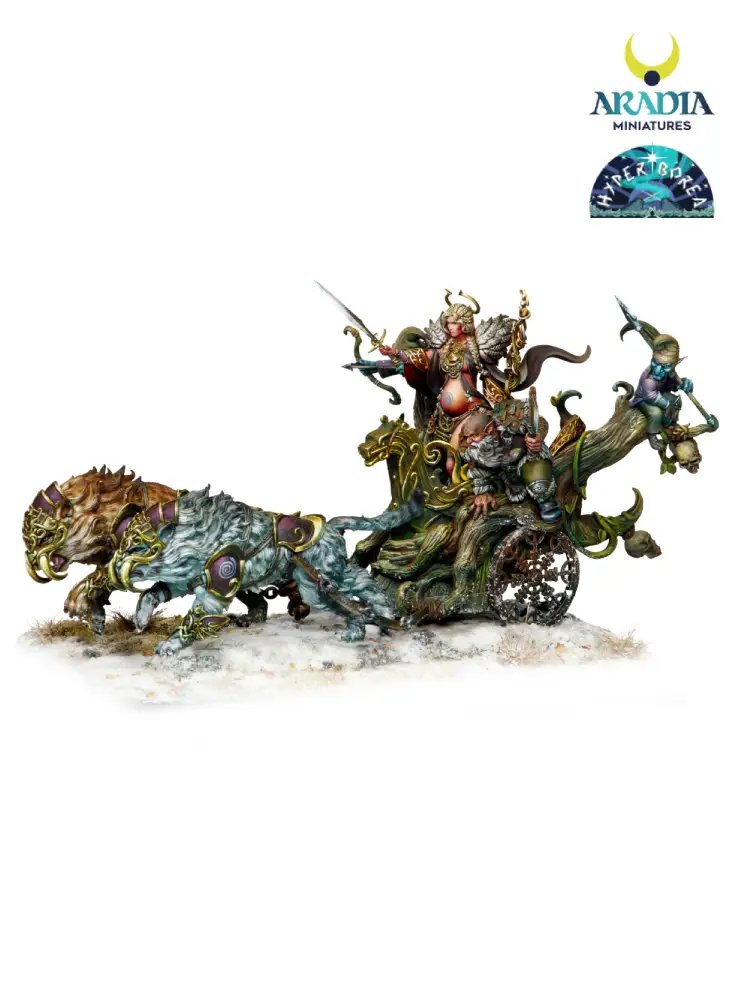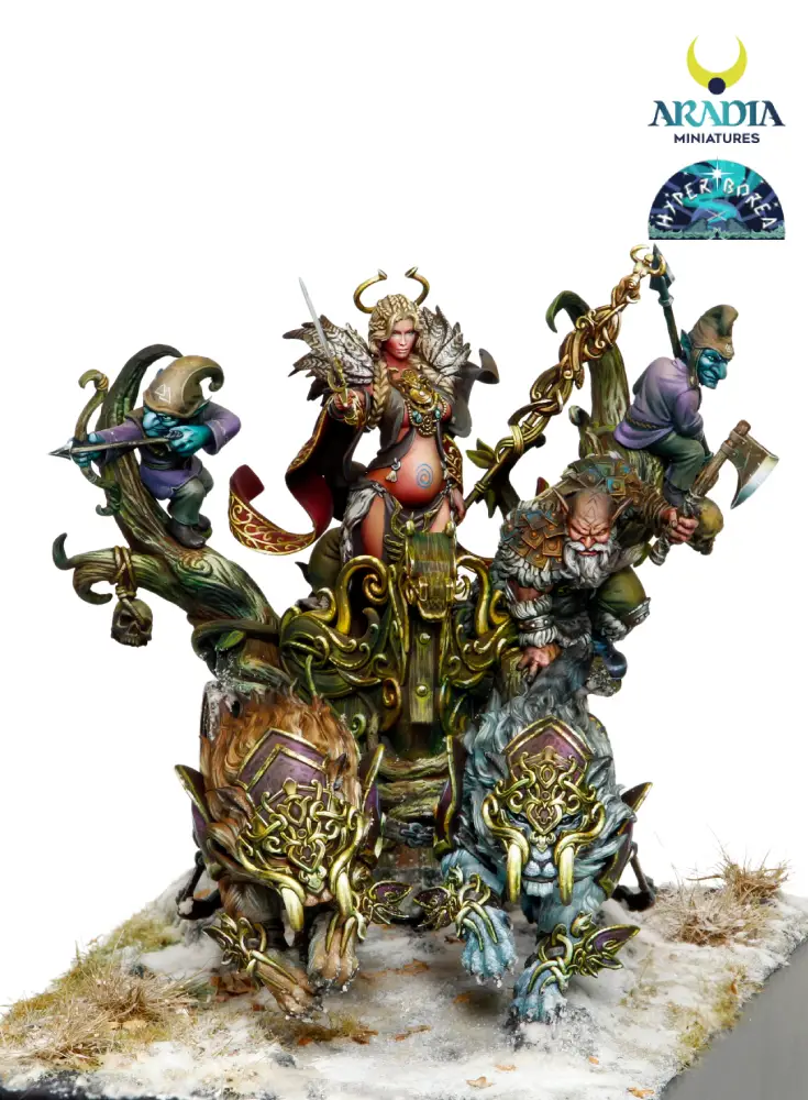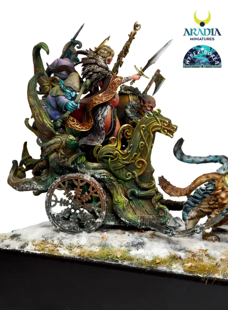Outstanding piece depicting the northern goddess Freya going to battle with her retinue of faithful dwarves. The entire diorama is crafted in 3D technology using the finest resin. It includes the female piece Freya, the chariot and her 4 loyal dwarf-soldiers 🎨.